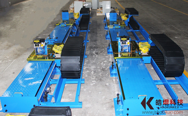 (3)、將行走單元移動至導(dǎo)軌的中間位置,先將行走單元兩側(cè)的八個墊板上的頂起螺栓頂住墊塊,但不繼續(xù)加力,將兩個水平儀置于行走單元的平面上,一個縱向、一個橫向,觀察縱向和橫向的水平情況,選擇四個方向中*高點為基準(zhǔn),從*低點開始調(diào)平,再利用其它幾點微調(diào),具體方法就是利用頂起螺栓頂起低點,至每米水平誤差0.2mm之內(nèi),中間位置調(diào)平后,移動行走單元,至幾個不同的位置,依次進(jìn)行調(diào)平,直至各位置水平符合要求,然后擰緊拉緊螺栓,用鎖緊螺母鎖緊頂起螺栓;